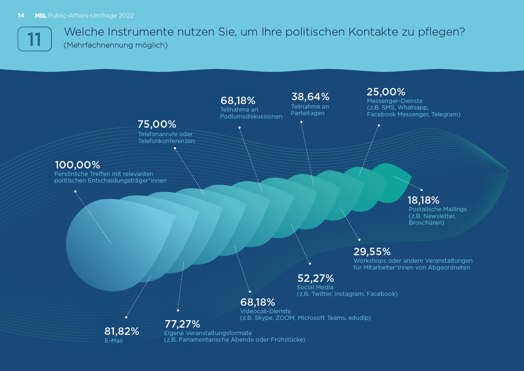 Während überwiegend digitale Public-Affairs-Veranstaltungen und -Formate das Jahr 2021 prägten, kamen in diesem Jahr auch persönliche Treffen wieder vermehrt zustande. Etwa 84 Prozent der Befragten gaben in der Umfrage jedoch an, dass einige Tools und Gewohnheiten aus der Corona-Zeit auch weiterhin beibehalten wurden. In der Umfrage 2021 erwarteten diese Entwicklung noch 92 Prozent der Teilnehmer*innen. Wichtigstes Instrument der Public-Affairs-Verantwortlichen ist nach wie vor das persönliche Treffen mit relevanten politischen Entscheidungsträger*innen (100 Prozent).