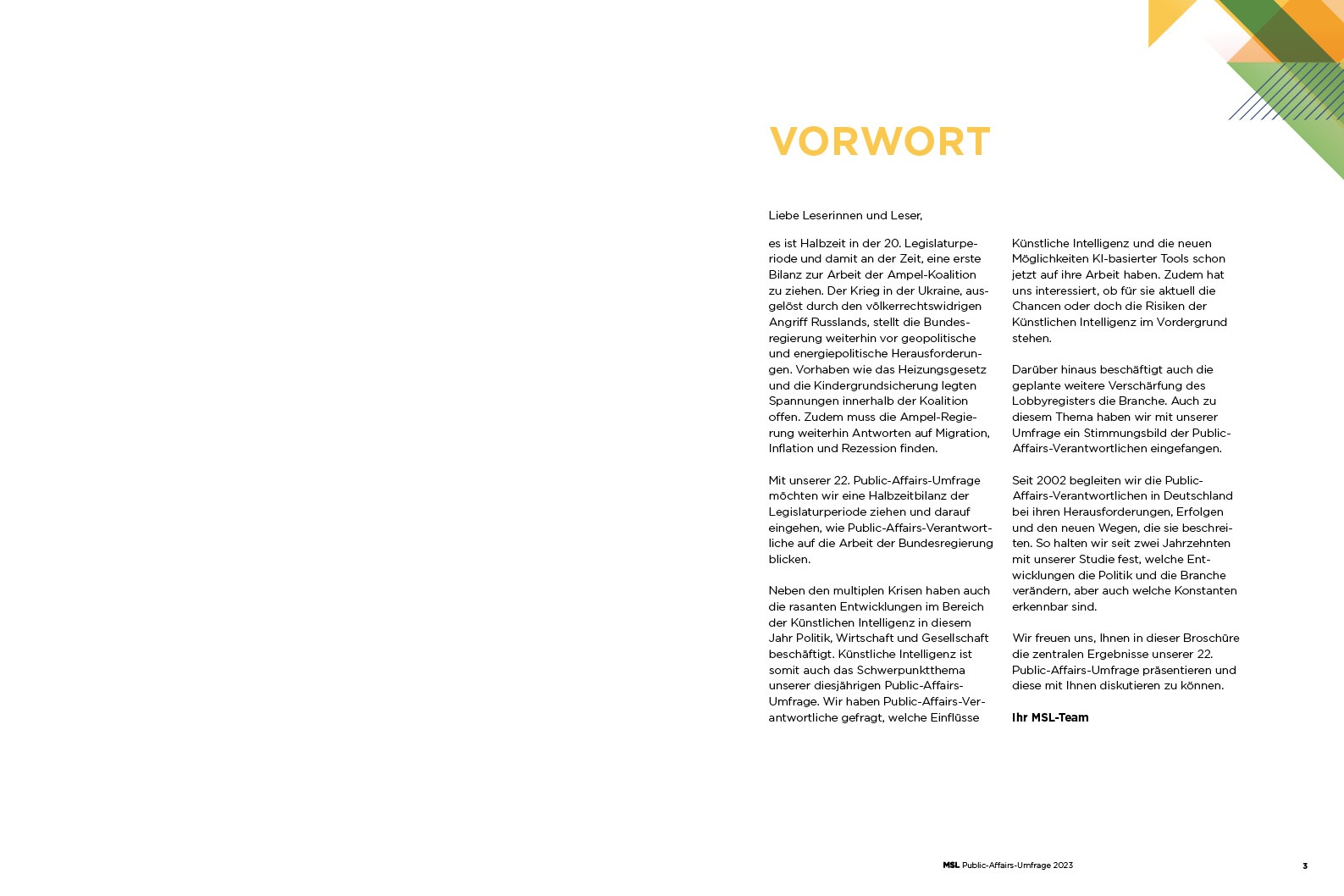 Während die erste Hälfte des Jahres 2023 die Bundesregierung erneut vor geo- und energiepolitische Herausforderungen stellte, haben auch die Spannungen innerhalb der Koalition zugenommen. Mit Blick auf die Halbzeit der Legislaturperiode bewerteten Public-Affairs- Verantwortliche die Arbeit der Bundesregierung im Rahmen der 22. Public-Affairs-Umfrage von MSL erneut kritisch. Den Zeitgeist des Public-Affairs-Arbeitsumfeldes prägten dieses Jahr die rasanten Entwicklungen im Bereich der Künstlichen Intelligenz und die damit verbundenen Veränderungen. Daher fokussiert sich die Umfrage auf KI und liefert Insights über Möglichkeiten und Risiken der neuartigen KI-Tools aus Sicht der Public-Affairs-Verantwortlichen. Ebenso Bestandteil der Umfrage sind die geplanten weiteren Verschärfungen des Lobbyregisters des Deutschen Bundestages.